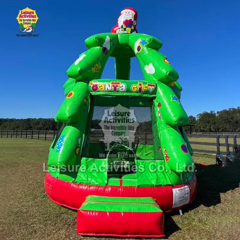Mini Inflatable Bouncy Castle Christmas: Inflatable Arbor Christmas for Kids' Outdoor Fun. Celebrate tempus Nativitatis cum gaudio et ludite! Hoc Mini Inflatable Bouncy Castle designatum est ut arbor Nativitatis, feriae colorum et forma Sanctae figurae donum tenens in summo archa. Perficiunt pro conventibus familiae, factiones feriae, eventus scholae, et promotiones temporariae.